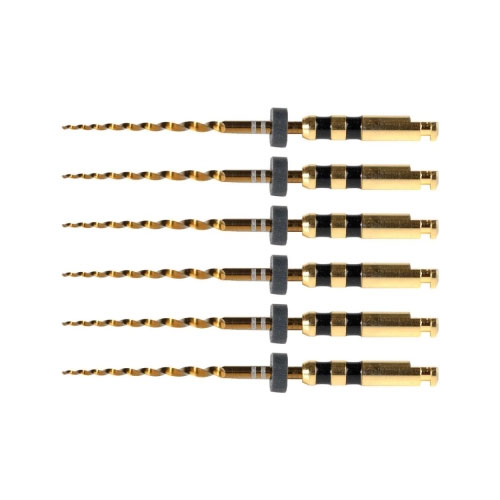 Guldfärgade maskinell roterande rotkanalsfil av värmebehandlad nickeltitan.