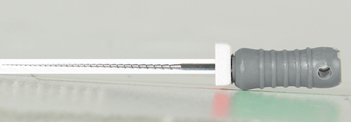 Steril rotkanalsfil enligt Hedström av rostfritt stål med filstopp och färgkodat skaft.