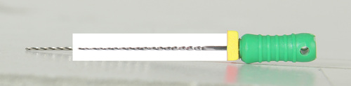 Steril rotkanalsfil av rostfritt stål med filstopp och färgkodat skaft.