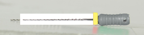 Steril rotkanalsfil av rostfritt stål med filstopp och färgkodat skaft.