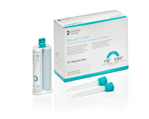 Aquasil Ultra LV (Low Viscosity) regular set, används i kombination med Aquasil Ultra DECA 380 regular set Heavy body, Heavy Body regular set 4 x 50 ml (ampull) eller Putty regular set 4 x 450 ml.