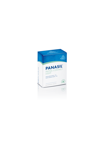 Additionshärdande, elastiskt precisionsavtrycksmaterial baserat på vinylpolysiloxan med mycket hög hydrofilicitet. Panasil initial contact Light är ett avtrycksmaterial med mycket låg viskositet som gärna kombineras med materialen Panasil binetics putty fast och den klassiska Panasil putty (i burk). Blandningsförhållande 1:1 Bearbetningstid vid 23 °C = 1 minut 30 sekunderBearbetningstid vid 35 °C = 1 minutIntraoral stelningstid vid 35 °C = 2 minuter 30 sekunder Total stelningstid* = 4 minuterHårdhet (ca) Shore A 46Linjär dimensionsförändring (max) % – 0.20 Elastiskt återtagande (ca) % 99.3 Deformering under tryck (ca) % 3.5 *) Total stelningstid (tid för avlägsnande från munnen) från påbörjad blandning.