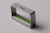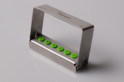 Borrställ i matt rostfritt stål med gröna silikonpluggar för kirurgiborr och HP-borr i längder upp till 45mm.