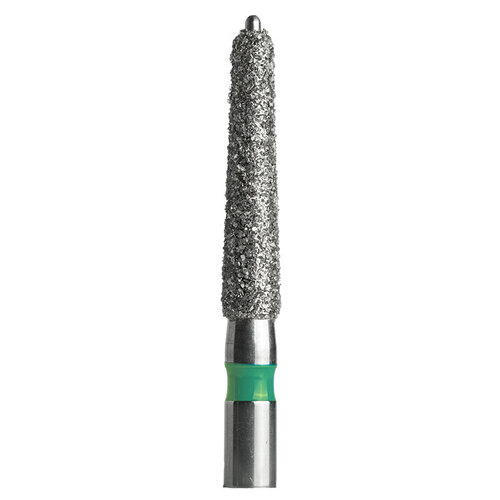 Konisk diamant med rundad topp och styrstift för kronpreparationer. FG-fattning. Kornstorlek: Grov (grön ring).