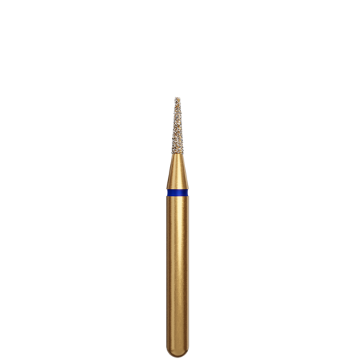 Koniskt formad guldfärgad preparationsdiamant med rak topp och FG-fattning.
