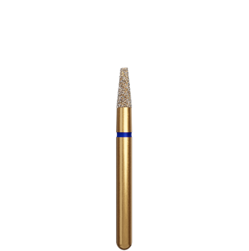Koniskt formad guldfärgad preparationsdiamant med rak topp och FG-fattning.