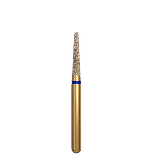 Koniskt formad guldfärgad preparationsdiamant med rak topp och FG-fattning.