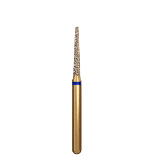 Koniskt formad guldfärgad preparationsdiamant med rak topp och FG-fattning.