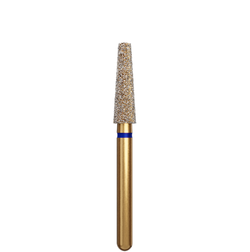 Koniskt formad guldfärgad preparationsdiamant med rak topp och FG-fattning.