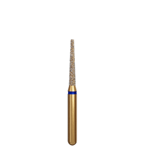 Koniskt formad guldfärgad preparationsdiamant med rak topp, kort skaft och FG-fattning.