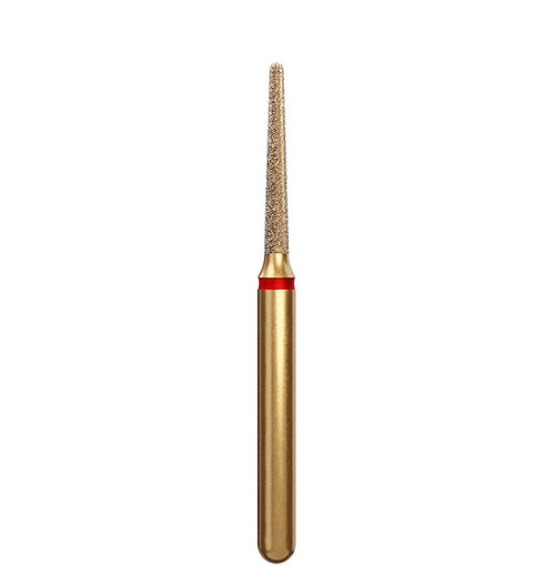 Konisk guldfärgad preparationsdiamant med rundad topp och FG-fattning.