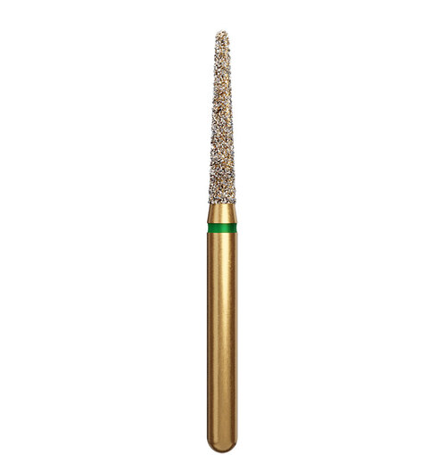 Konisk guldfärgad preparationsdiamant med rundad topp och FG-fattning.