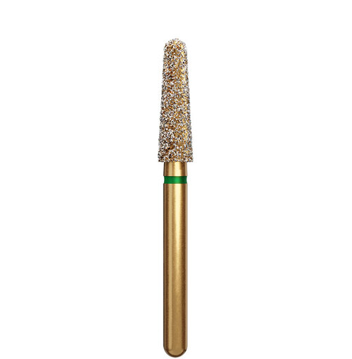 Konisk guldfärgad preparationsdiamant med rundad topp och FG-fattning.