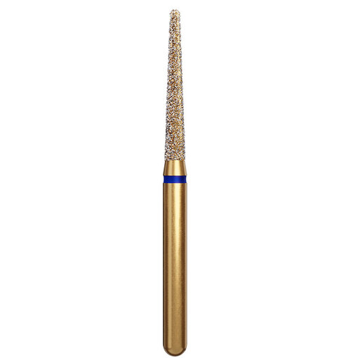Lång konisk guldfärgad preparationsdiamant med rundad topp och FG-fattning.