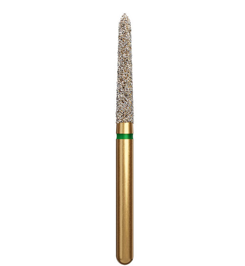 Cylinderformad konisk med spetsig topp (torped) guldfärgad preparationsdiamant med FG-fattning.