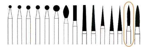 Flamformad preparationsdiamant med vinkelstyckefattning. Kornstorlek: Medium. Storlek 014. ISO: 806204001524014.
