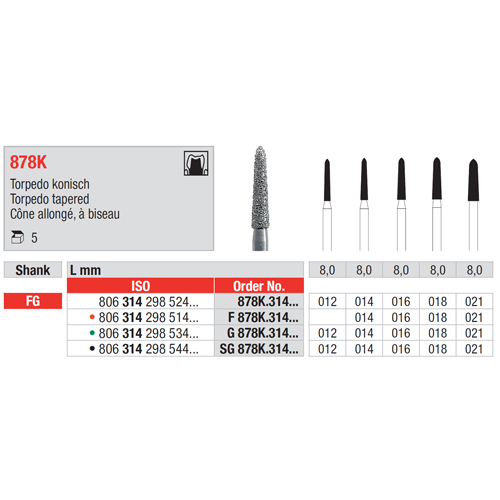 Koniskt formad preparationsdiamant med spetsig topp (torped) och FG-fattning.