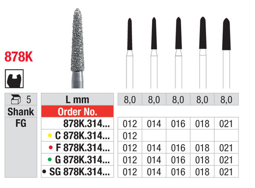 Koniskt formad preparationsdiamant med spetsig topp (torped) och FG-fattning.