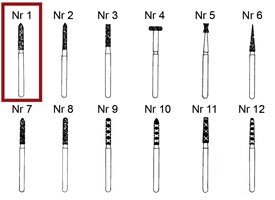 Nr 1 - Tjocka spetsen. Cylinderformad rak spetsig preparationsdiamant med FG-fattning för kronpreparation och kavitetspreparation. Skaftet av rostfritt stål och arbetsdelen belagd med naturdiamant med kornstorlek grov på 100 my. Färgkod: svart. ISO Nr 839-016.