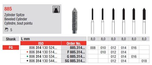 Cylinder formad preparationsdiamant med spetsig topp (avfasad) och FG-fattning.