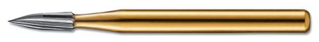 Nålformad guldfärgad 12-bladig finisheringsborr av hårdmetall med FG-fattning.