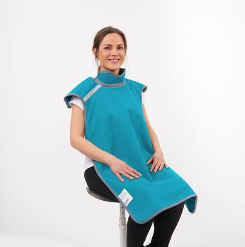 Vändbart tvåfärgat röntgenskyddsförkläde med krage för liggande eller sittande patient. Förklädet är av flexibelt blygummi med yta i Comfor-tex, blyekvivalens Pb 0,5 mm. Färg: Curacao (turkos) / Orchidee (rosaröd).
