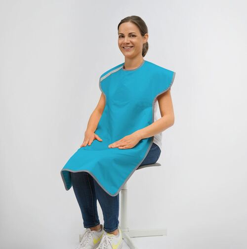 Röntgenskyddsförkläde utan krage för sittande patient. Bakknäppt förkläde av flexibelt blygummi med yta i Comfor-tex, blyekvivalens Pb 0,5 mm. Färg: Curacao (Turkos).