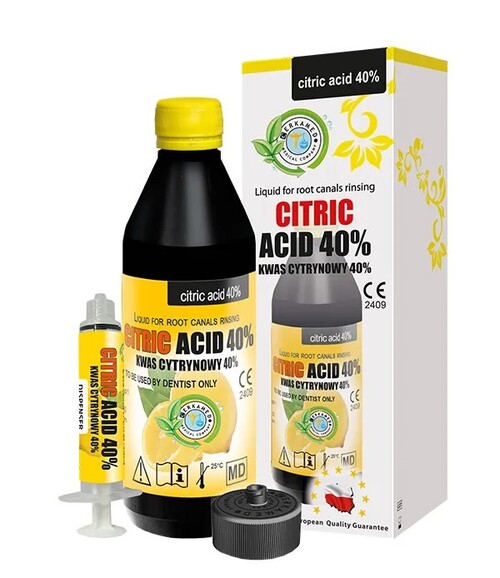 Cerkamed Citronsyra 40% är en endodontisk spolvätska avsedd för spolning av rotkanaler under rotbehandling. Produkten stödjer den mekaniska rengöringen av kanalen genom att avlägsna smear layer, så att dentintubuli exponeras och kan rengöras mer effektivt.