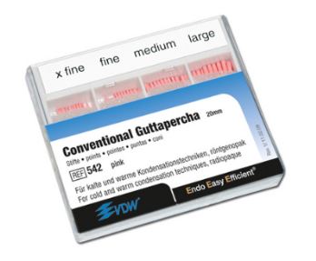 Lateralpoints, konventionella guttaperkaspetsar. Utfyllnadspoints vid masterpoint-metod. För varm och kall kondenseringsteknik, radiopak.