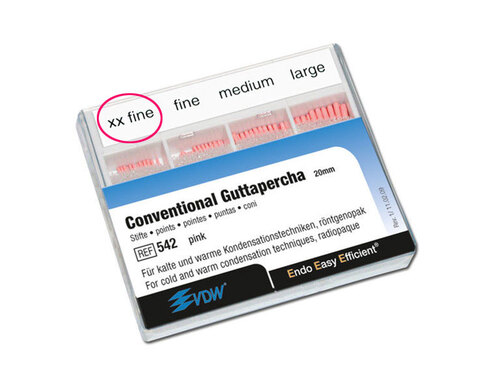 Lateralpoints, konventionella guttaperkaspetsar. Utfyllnadspoints vid masterpoint-metod. För varm och kall kondenserings teknik, radiopak. Längd: 20 mm. Färg: Rosa. Storlek: XX-fin.