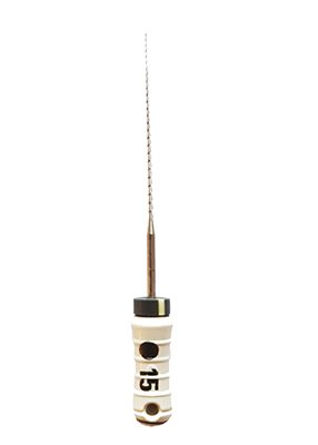 Hedströmsfil med filstopp i rostfritt stål. Filen är sterilförpackad i blisterförpackning och färdig att använda. Filen har ett runt stålämne och spiralskuren egg. God avverkningsförmåga. Längd: 28 mm. ISO 15. Färgkod: Vit.
