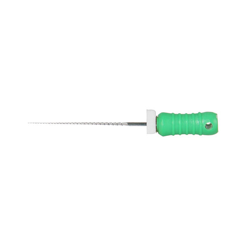 Steril rotkanalsfil enligt Hedström av rostfritt stål med filstopp och färgkodat skaft.