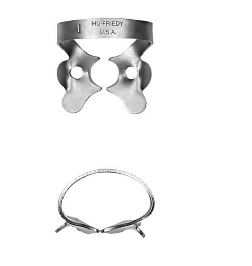Kofferdamklammer för premolarer i överkäken, i rostfritt stål, med sidenmatt yta, för att ej reflektera ljus.