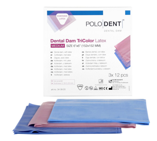 PoloDent TriColor kofferdam innehåller latex och har ett lågt puderinnehåll.