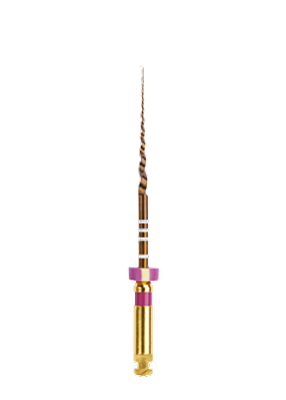 Guldfärgad roterande rotkanalsfil av specialbehandlad nickeltitan för maskinell rensning.