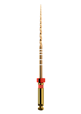 Guldfärgad roterande rotkanalsfil av specialbehandlad nickeltitan för maskinell rensning.