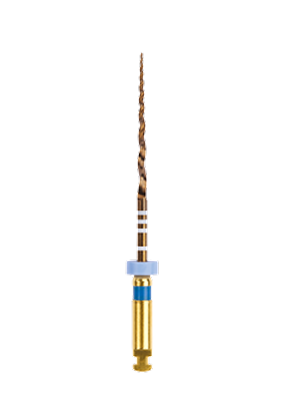 Guldfärgad roterande rotkanalsfil av specialbehandlad nickeltitan för maskinell rensning.