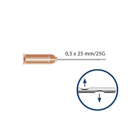 Skonsam spolkanyl med rundad sluten ände och två laterala öppningar på sidan av kanylen för att undvika press på apex.