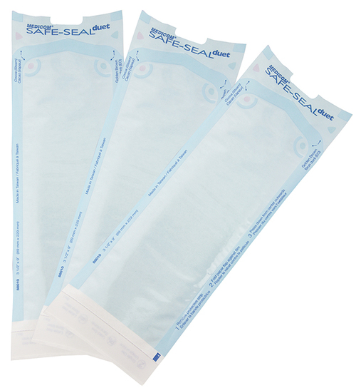 Färdigklippta självförslutande sterilpåsar av papper/plast för packning av instrument vid autoklavering. Blå.