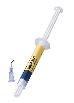 Blå tixotrop 37 % fosforsyra i gelform i spruta och med vinklad kanyl.