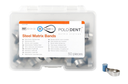 Dubbelkonturerade anatomiskt formade matrisband, vinklade för enkel anpassning. Stabila och konstruerade för att förhindra glidning. Rostfritt stål.