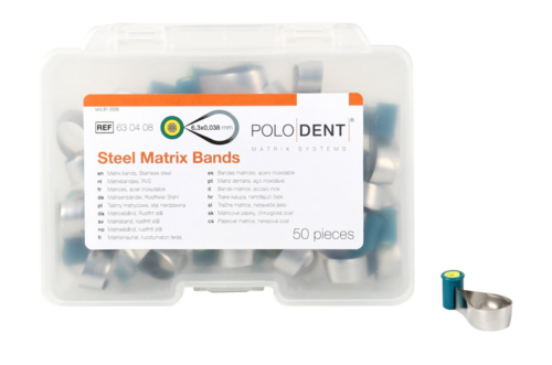 Dubbelkonturerade anatomiskt formade matrisband, vinklade för enkel anpassning. Stabila och konstruerade för att förhindra glidning. Rostfritt stål.