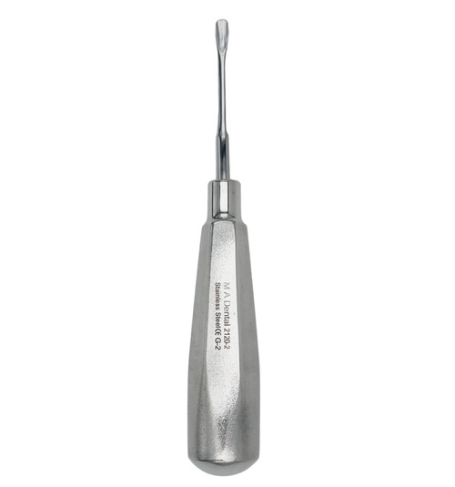 Rak luxationshävel av rostfritt stål med tunn skarp arbetsdel för att skära av parodontala ligament.