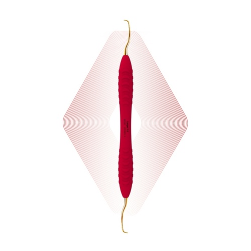 Dubbeländad slipfri universalcurette med belagda guldfärgade arbetsdelar och ergonomiskt silikongrepp.