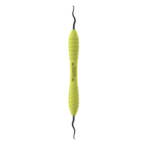 Dubbeländad slipfri universalcurette/finisheringscurette med belagda svarta arbetsdelar och ergonomiskt silikongrepp.