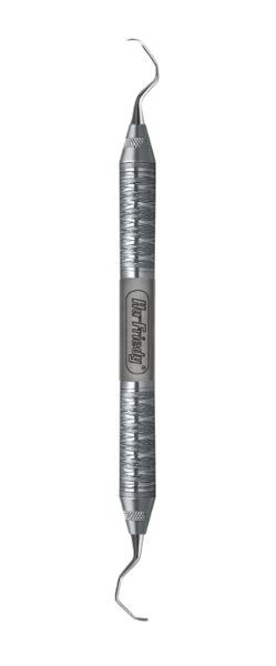 Styv (rigid) dubbeländad Gracey-kyrett med mindre klinga och något längre terminalskaft samt framhävd vinkling.