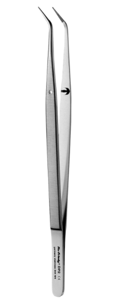 Pincett med tandad spets för ett säkert grepp och en låsmekanism. Används för att gripa eller överföra material in i och ut ur munhålan.