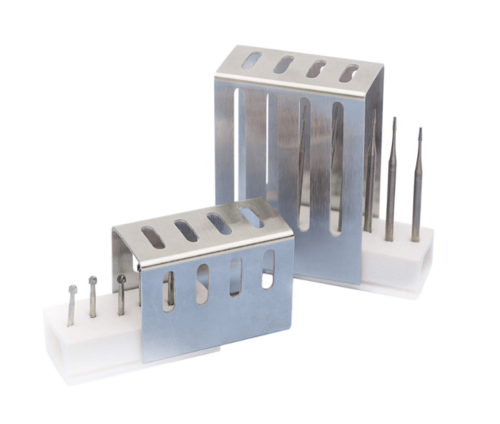 Borrhållare med en ihålig, rektangulär silikonbas och ett lock i rostfritt stål, utformad för att hålla borrar säkert på plats under rengöring och sterilisering. Den ihåliga designen möjliggör dränering och korrekt rengöring.