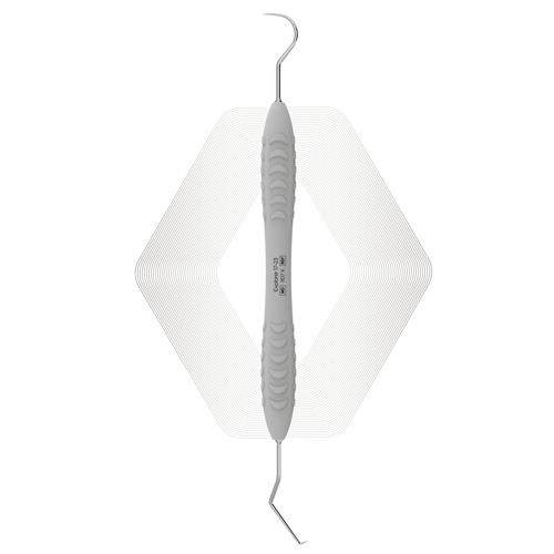 Dubbeländad undersökningssond för diagnostisering. I ena änden böjd, andra änden har en lång nedrehals med "Back-action" spets. Ergonomiskt grått silikonhandtag.