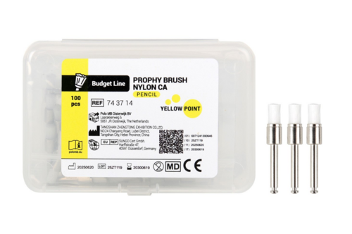 Budget Line Prophyborstar i nylon. Effektiva för rengöring och polering utan att skada emalj eller tandkött.